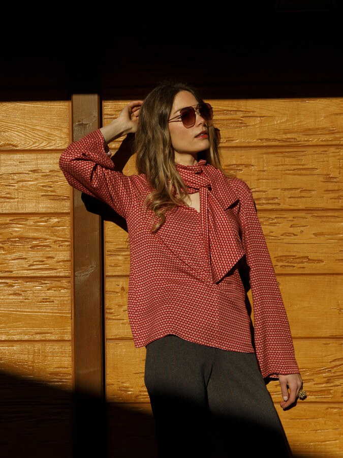 Blusa femenina, delicada y versátil con escote en pico y corte fluído que favorece la silueta sin marcar, mientras que las mangas ligeramente acampandas aportan movimiento a la prenda. El protagonista del diseño es un maxi lazo que eleva la prenda.