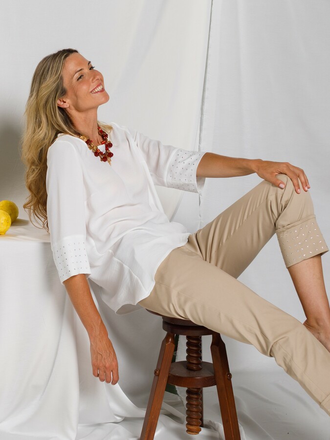 Top blanco de silueta amplia y cómoda, diseñado para ofrecer una caída fluida y favorecedora. Presenta manga al codo, decorada con tachuelas, un detalle que añade carácter y un toque contemporáneo al diseño.