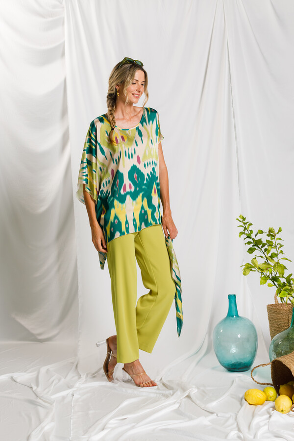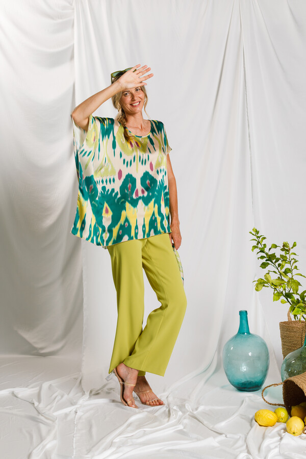 Blusón estampado de diseño original que combina diferentes volúmenes en las mangas para crear una silueta moderna y con carácter. Presenta una manga murciélago, cerrada mediante pespunte y rematada con repulgo, detalle que aporta ligereza y una terminación delicada.