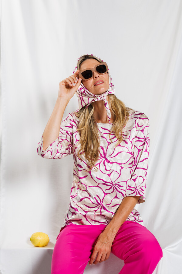 Top estampado de silueta holgada, pensado para ofrecer comodidad y una caída fluida sobre el cuerpo. Su diseño se caracteriza por el bajo con forma de picos, que aporta movimiento y un acabado dinámico a la prenda.