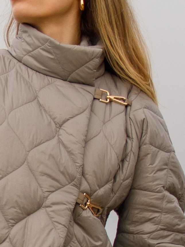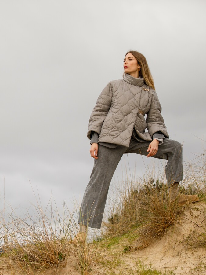 Este chaquetón acolchado gris combina comodidad, diseño contemporáneo y calidez, ideal para los días fríos. Confeccionado en un tejido suave y ligero, presenta un acolchado de rombos que aporta volumen sin sacrificar la silueta. Su cuello alto envolvente ofrece protección extra contra el viento, mientras que el cierre lateral con hebilla metálica dorada añade un toque sofisticado y original.