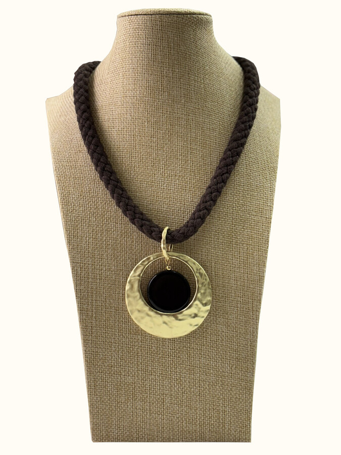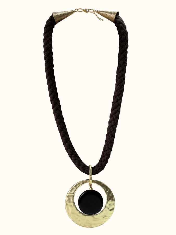 Collar corto de cordón marrón trenzado de algodón y pieza inox hecha a mano, con piedra negra y marrón en el centro.