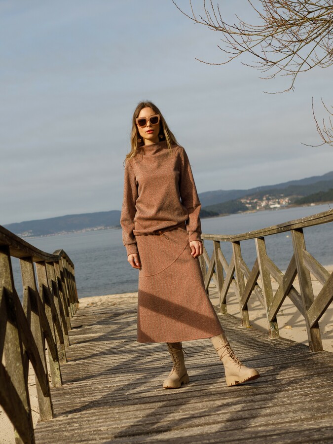 Falda de punto fino en color marrón tostado con un elegante jaspeado. Su diseño midi con corte asimétrico aporta un aire moderno y estilizado, mientras que el ligero vuelo en el bajo le da movimiento y feminidad a cada paso.