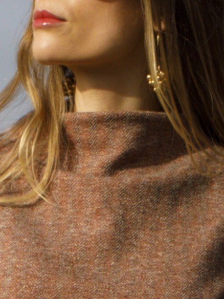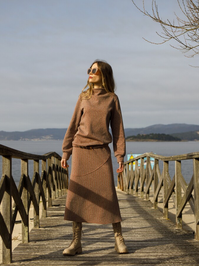 Jersey de punto fino en color marrón tostado con un ligero jaspeado, ideal para entretiempo y días frescos. Su diseño con cuello chimenea estiliza el cuello con un toque moderno y elegante. Las mangas largas terminadas en puño engomado aportan comodidad y un ajuste perfecto, mientras que el bajo engomado ajustable permite adaptarlo a la silueta, logrando un look más entallado o relajado según la ocasión.