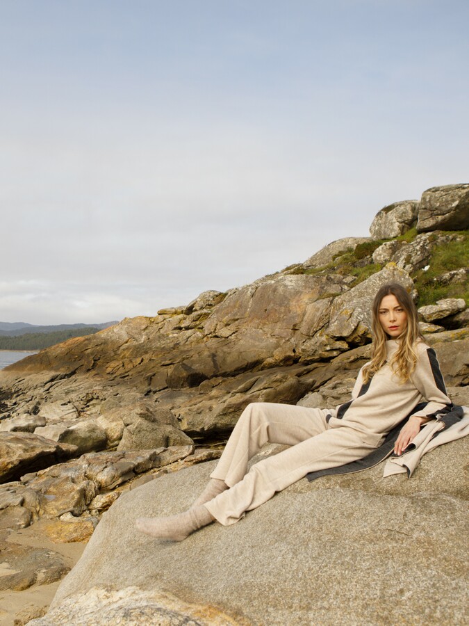 El tejido de punto, ligero y cálido, ofrece una caída fluida y un tacto agradable sobre la piel, ideal para entretiempo o climas frescos.