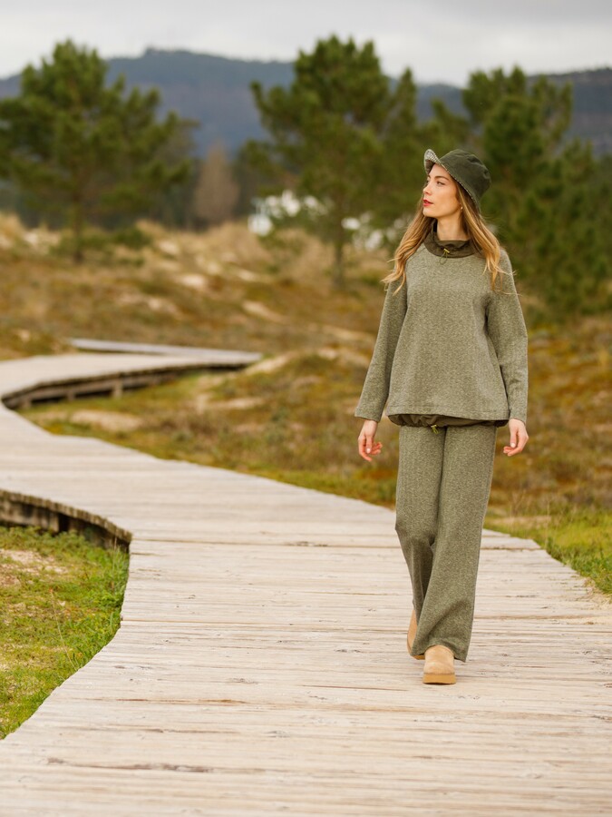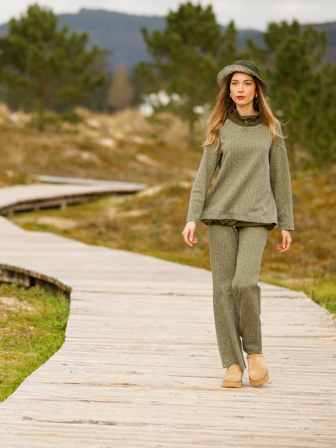Pantalón de punto en tono verde jaspeado, de corte recto y fluido, que estiliza la figura y aporta comodidad en cada movimiento. La cintura elástica con goma asegura un ajuste perfecto y confortable, adaptándose a diferentes siluetas sin oprimir.
