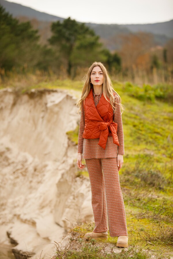 Pantalón de punto con estampado pata de gallo en tonos cálidos, un clásico renovado que aporta estilo y comodidad. Su diseño de cintura elástica con goma asegura un ajuste perfecto y favorecedor, adaptándose a la silueta sin oprimir.