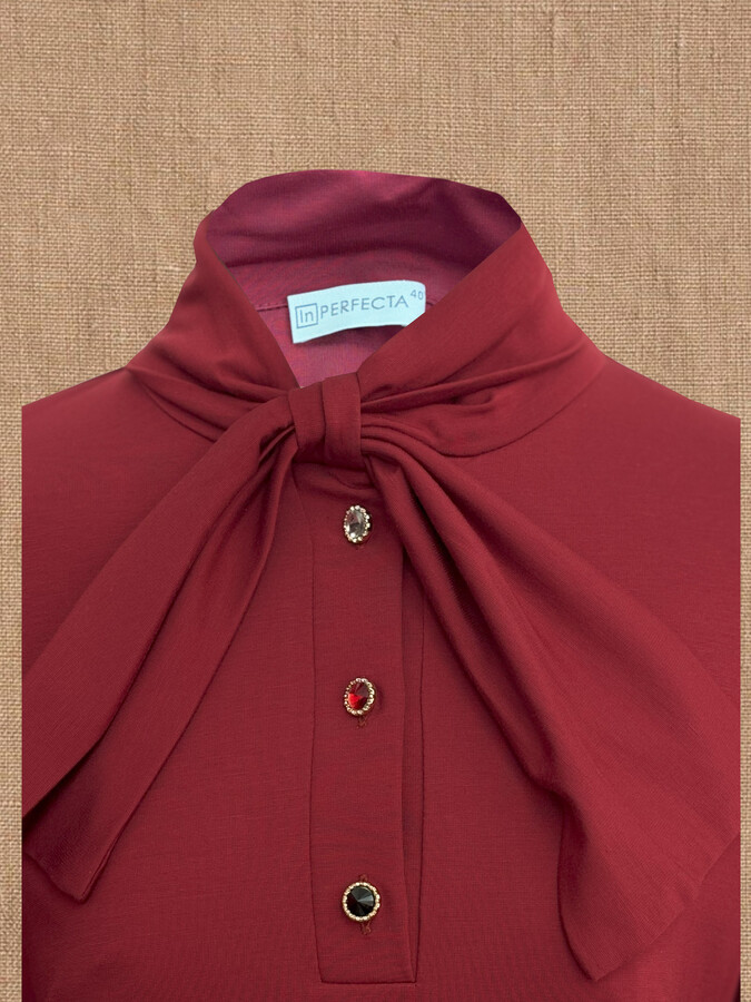 Elegante, femenino y con un toque distintivo, este polo de diseño en color burdeos es la definición de sofisticación atemporal con un giro moderno. Confeccionado en un tejido suave y estructurado, su silueta fluida se realza con detalles únicos que lo convierten en una prenda protagonista.