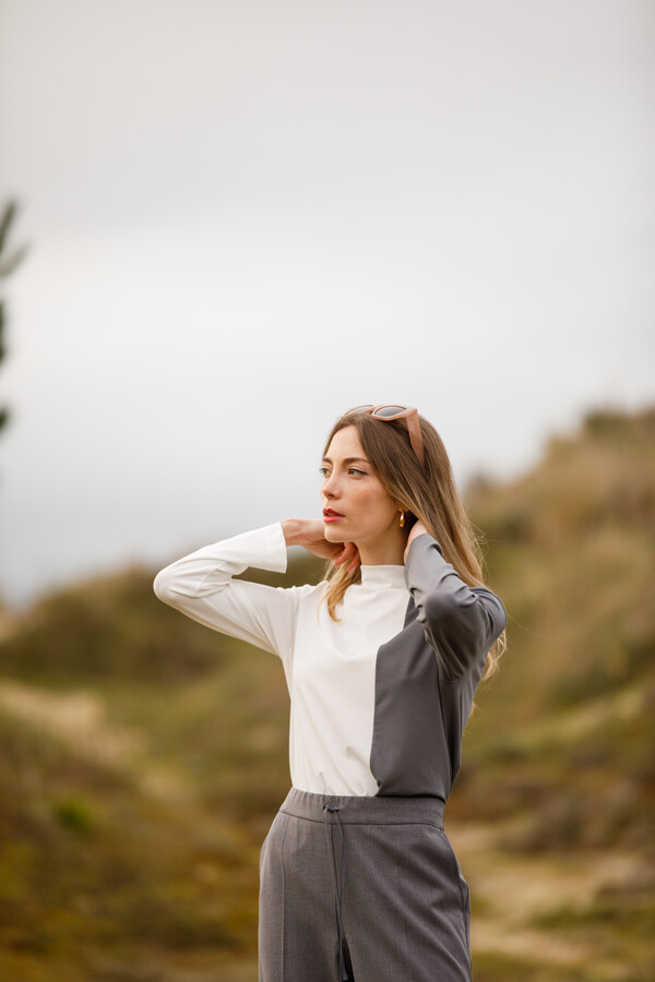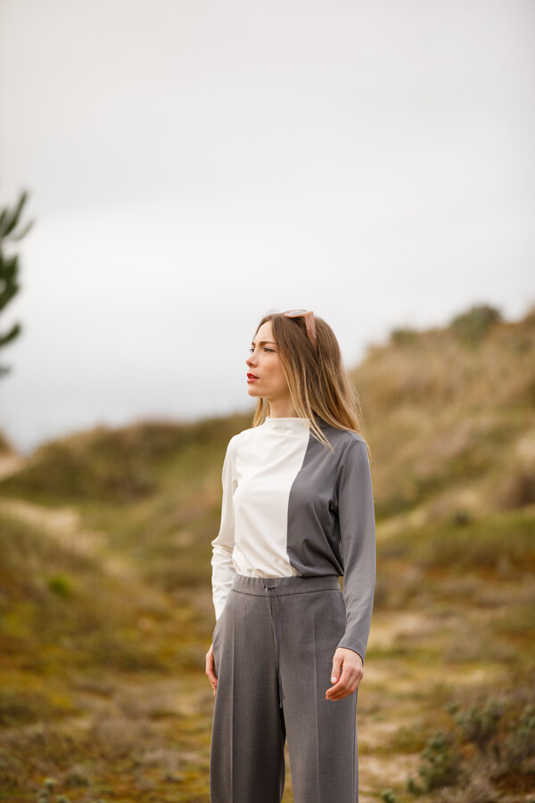 Aporta un toque de sofisticación casual con este polo bicolor de manga larga para mujer, confeccionado en un tejido suave y confortable que se adapta a tu día a día. Su diseño moderno combina paneles en contraste blanco y gris que estilizan la silueta, mientras que el cuello chimenea le da un aire minimalista y elegante. Versátil y fácil de combinar, es la prenda ideal para llevar con pantalones de vestir o vaqueros, logrando un look contemporáneo y lleno de estilo.