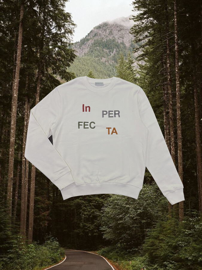 Sudadera cruda con bordado multicolor "InPERFECTA". De base neutra, textura suave y estructura oversize confeccionada en algodón ECO con interior afelpado. Esta prenda ofrece una sensación cálida y envolvente, ideal para los días fríos.