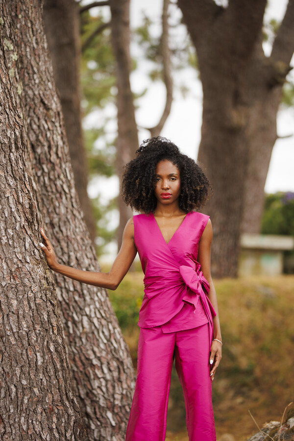 Chaleco confeccionado en tafetán, tejido con cuerpo y ligero brillo que aporta estructura y sofisticación al diseño. Su corte cruzado define la silueta y crea un efecto elegante y contemporáneo.