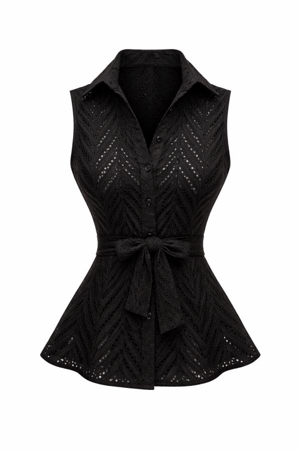 Top de diseño sofisticado que combina elementos clásicos y actuales. Presenta cuello camisero con tirilla en algodón calado, aportando textura y un acabado delicado.
