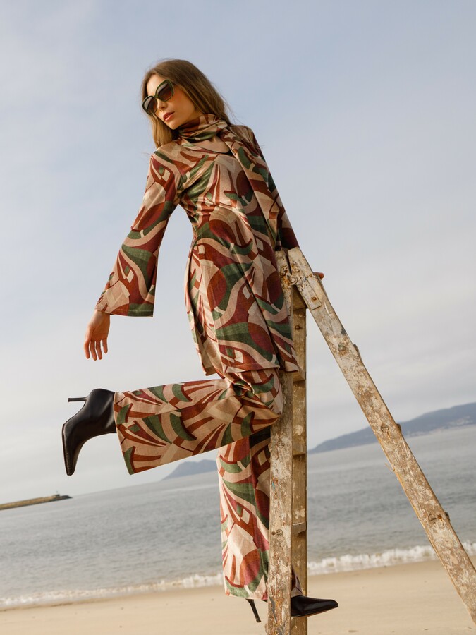 Completa tu look de invitada con esta túnica estampada de diseño exclusivo, creada para brillar en bodas, cócteles, cenas de gala y celebraciones especiales. Confeccionada en tejido fluido y ligero, su estampado geométrico en tonos tierra, beige, marrón y verde aporta un aire artístico y sofisticado que no pasa desapercibido.