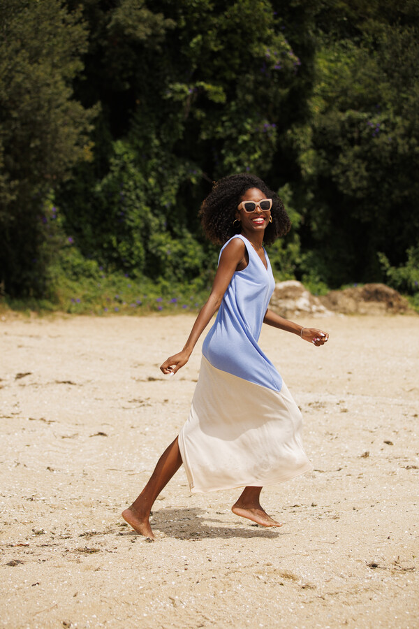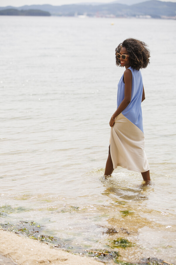 Destaca por su corte asimétrico, que incorpora una abertura en un lateral, generando movimiento y un efecto visual dinámico. El acabado a dos tonos refuerza su carácter contemporáneo y aporta profundidad al diseño.