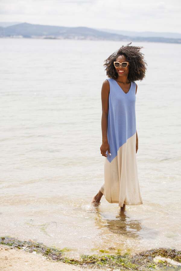 Vestido confeccionado en punto, de tacto suave y caída adaptable que acompaña la silueta con comodidad. Presenta escote en pico, que estiliza la parte superior y aporta un aire elegante al diseño.