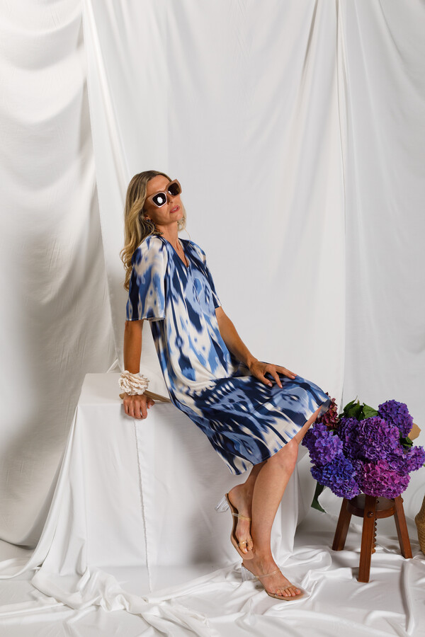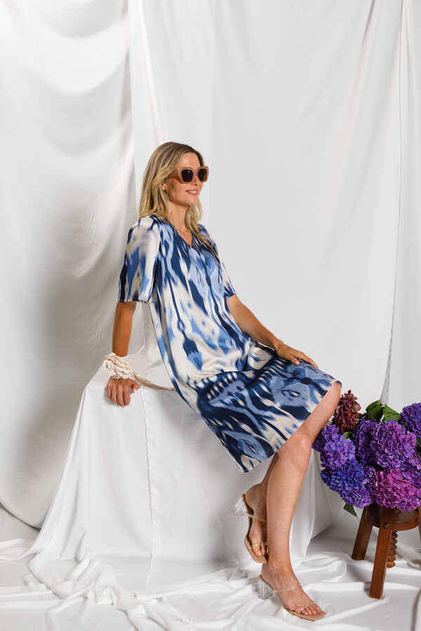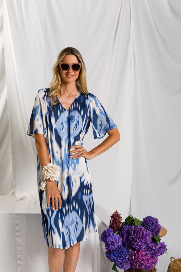 Eleva tu estilo con este elegante vestido estampado de corte holgado, diseñado con una favorecedora silueta en A que se adapta con fluidez a tu figura. Su escote en pico estiliza el cuello y aporta un toque femenino, mientras que las mangas de vuelo de largo tres cuartos añaden movimiento y sofisticación.