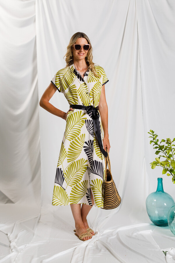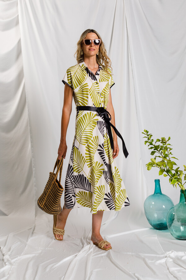 Vestido camisero con estampado de palmeras, que aporta un aire fresco y elegante al diseño. Presenta corte en la cintura, que estructura la silueta y realza la figura de forma natural.