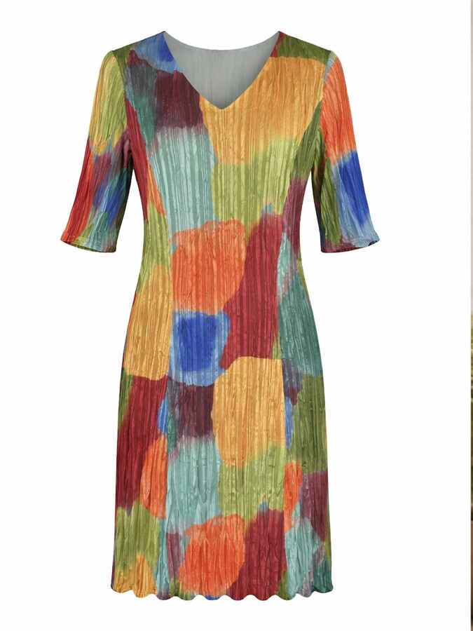 Vestido plisado con forro interior, escote pico y manga tres cuartos.